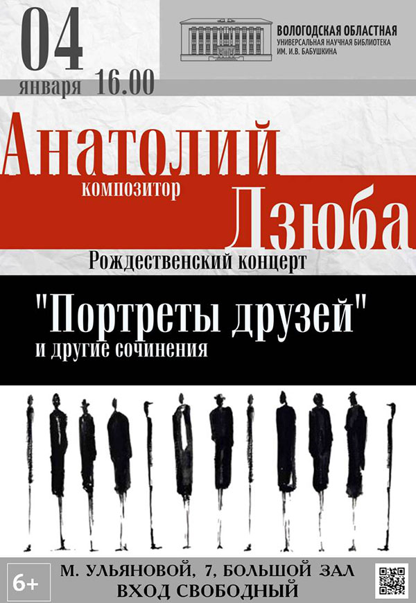 «Портреты друзей» и другие сочинения» – так называется сольный концерт молодого композитора Анатолия Дзюбы, который он традиционно дарит вологжанам в канун Рождества. Мероприятие пройдет в субботу, 4 января, в Большом зале Областной библиотеки им. И.В. Бабушкина (М. Ульяновой, 7).