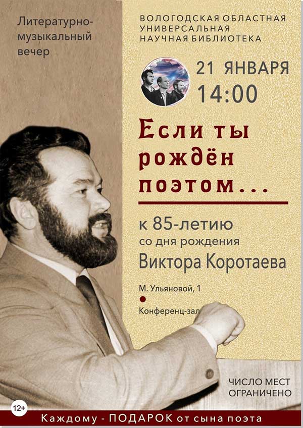 Литературно-музыкальный вечер «Если ты рожден поэтом…», посвящённый 85-летию со дня рождения поэта, прозаика и общественного деятеля, заслуженного работника культуры Российской Федерации Виктора Вениаминовича Коротаева (1939-1997) пройдет в воскресенье, 21 января (М. Ульяновой, 1, конференц-зал).