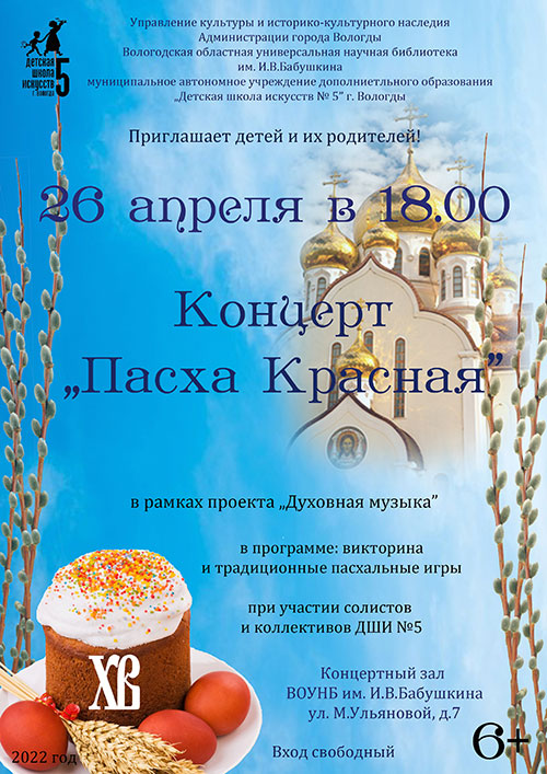 В течение многих лет жители Вологды приходят в Большой зал Областной библиотеки на ставшие традиционными пасхальные концерты, которые вместе с библиотекой проводят для них солисты и коллективы городской Детской школы искусств № 5.