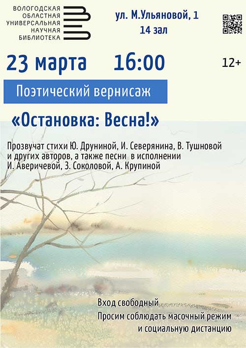Музыкально-поэтический вечер под названием «Остановка: Весна!» пройдет во вторник, 23 марта, в зале № 14 Вологодской областной научной универсальной библиотеки (М. Ульяновой, 1) в рамках мероприятий, посвященных Всемирному дню поэзии.