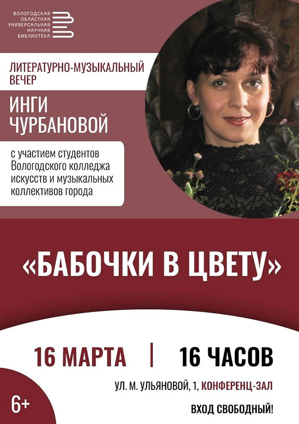 Литературно-музыкальный вечер «Бабочки в цвету» кандидата филологических наук, члена Союза писателей России, поэта Инги Чурбановой пройдет в субботу, 16 марта.