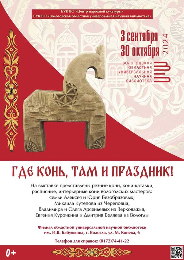 Областная выставка художественной резьбы по дереву «Где конь, там и праздник!» будет работать с 3 сентября по 30 октября в филиале Вологодской областной универсальной научной библиотеки (Конева, 6).
