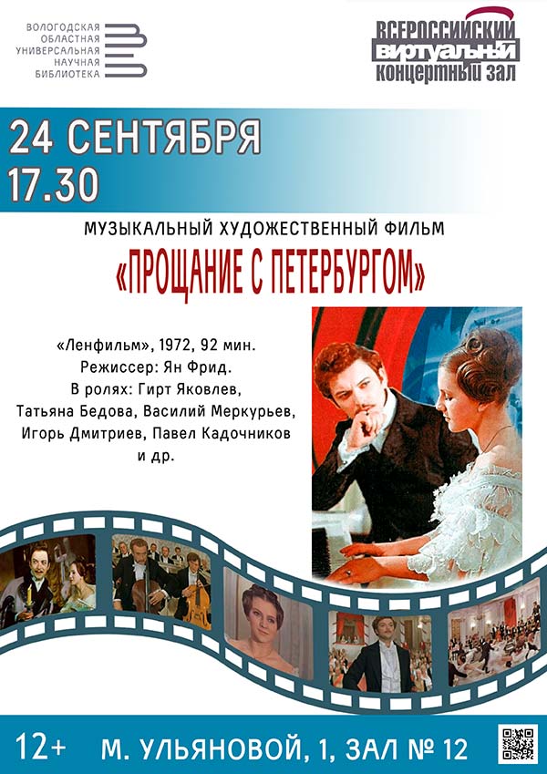 Во вторник, 24 сентября, в зале № 12 библиотеки состоится показ музыкального художественного фильма «Прощание с Петербургом».