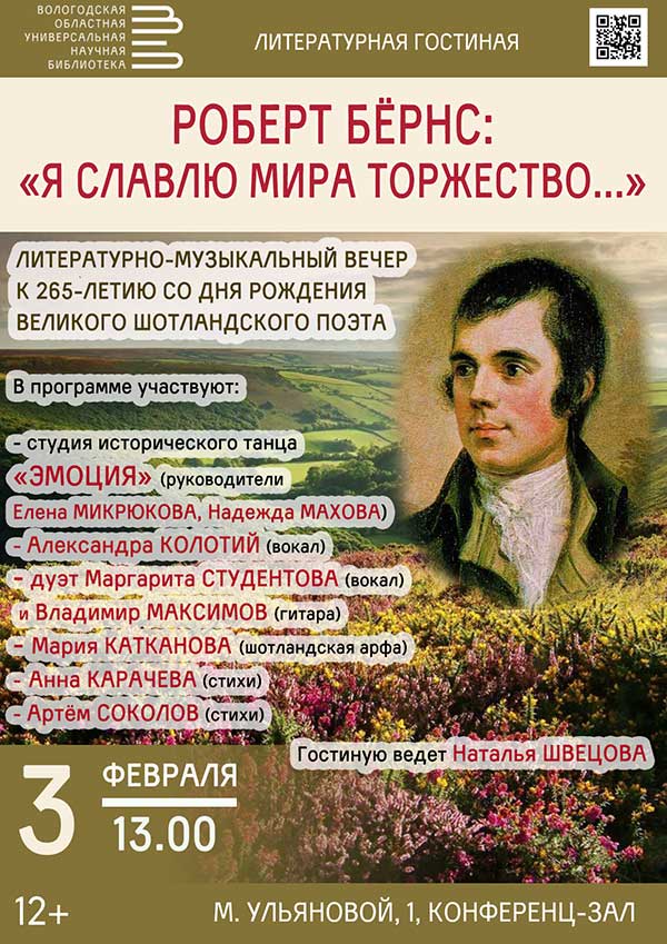 Литературно-музыкальный вечер «Я славлю мира торжество…», посвященный 265-летию со дня рождения великого шотландского поэта Роберта Бёрнса, пройдет в субботу, 3 февраля в рамках проекта «Литературная гостиная».