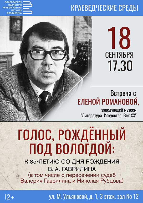18 сентября Областная библиотека приглашает на встречу, посвященную композитору Валерию Александровичу Гаврилину и поэту Николаю Михайловичу Рубцову. О пересечении судеб наших выдающихся земляков расскажет Елена Романова, заведующая музеем «Литература. Искусство. Век XX» (филиал Вологодского государственного историко-архитектурного и художественного музея-заповедника).