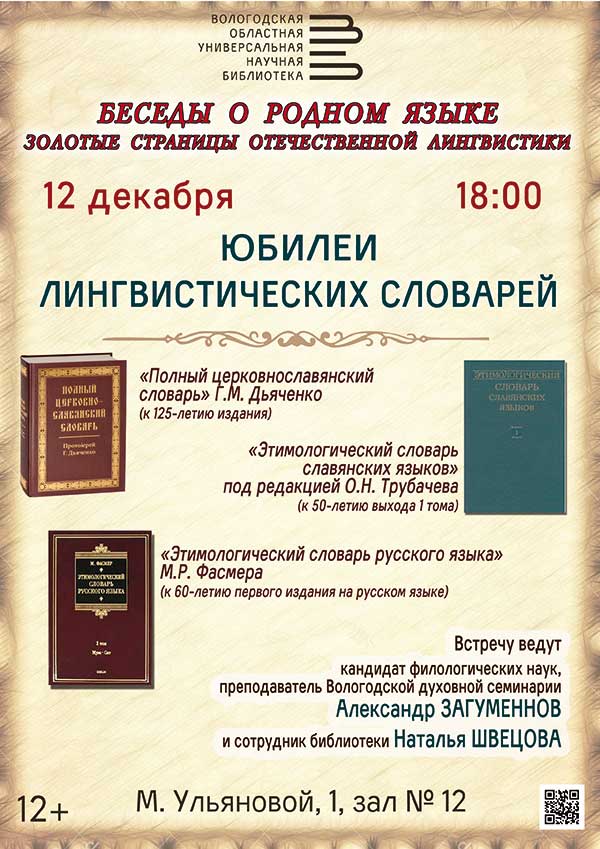 Об этих словарях и их создателях расскажут кандидат филологических наук, преподаватель Вологодской духовной семинарии Александр Загумённов и сотрудник Областной научной библиотеки, филолог Наталья Швецова.