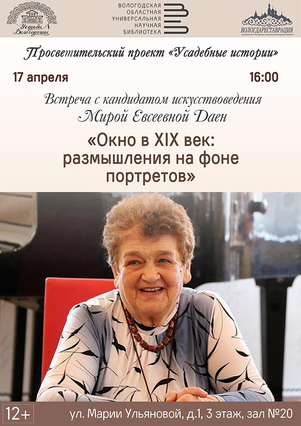 Выступление «Окно в XIX век: размышления на фоне портретов» кандидата искусствоведения, члена Союза художников России, заслуженного работника культуры России Миры Евсеевны Даен состоится в среду, 17 апреля, в рамках проекта «Усадебные истории».