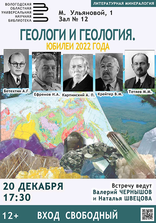 Новая встреча проекта «Литературная минералогия», посвященная известным ученым-геологам, юбилярам текущего 2022 года, пройдет во вторник, 20 декабря в 17 часов 30 минут (М. Ульяновой, 1, зале № 12).