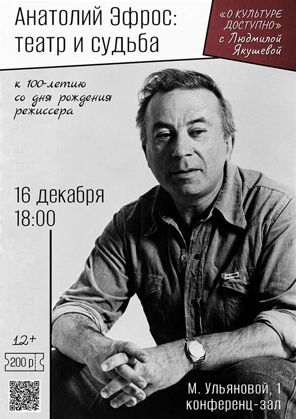Расскажет о творчестве и судьбе Анатолия Эфроса бессменный лектор проекта – культуролог, доцент кафедры культурологии ВоГУ, финалист конкурса «Знание. Лектор» Людмила Алентиновна Якушева.