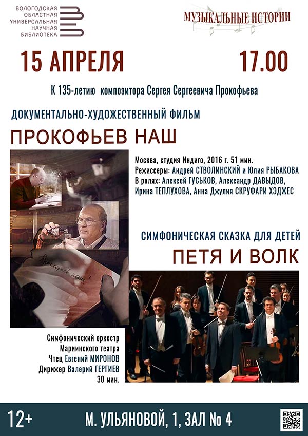 Показы документально-художественного фильма «Прокофьев наш» и музыкальной сказки для симфонического оркестра «Петя и волк», посвященные 135-летию великого русского композитора Сергея Сергеевича Прокофьева, пройдут в среду, 15 апреля, в рамках проекта «Музыкальные истории».