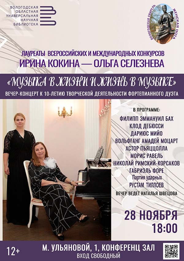 Вечер-концерт «Музыка в жизни и жизнь в музыке», посвященный десятилетию творческой деятельности лауреатов всероссийских и международных конкурсов, фортепианного дуэта Ирины Кокиной и Ольги Селезневой пройдет в пятницу, 28 ноября, в рамках музыкально-просветительского проекта «Вологодская Свирель. Женская нота».