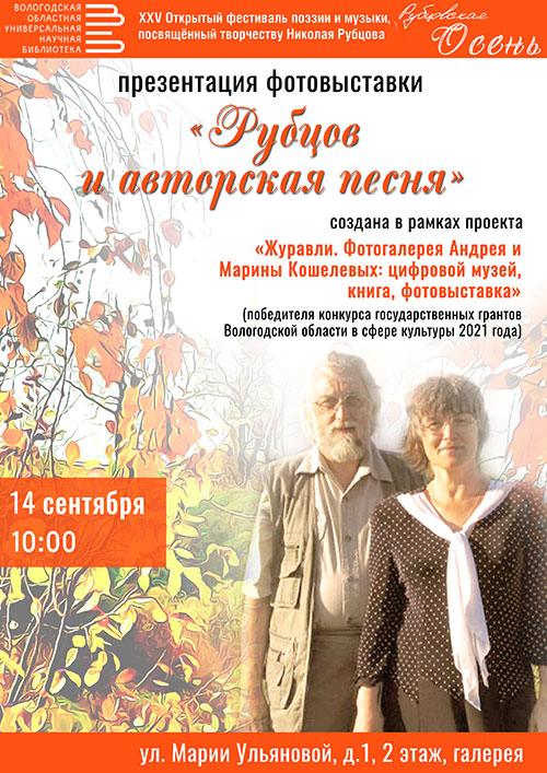 14 сентября, в среду, в дни XXV Открытого фестиваля поэзии и музыки «Рубцовская осень» Вологодская областная научная библиотека приглашает всех желающих на презентацию фотовыставки Андрея и Марины Кошелевых «Рубцов и авторская песня» (ул. М. Ульяновой, д. 1, Атриум. 2 этаж), а также концертную программу «Журавли» (ул. М. Ульяновой, д. 1, конференц-зал, 3 этаж).