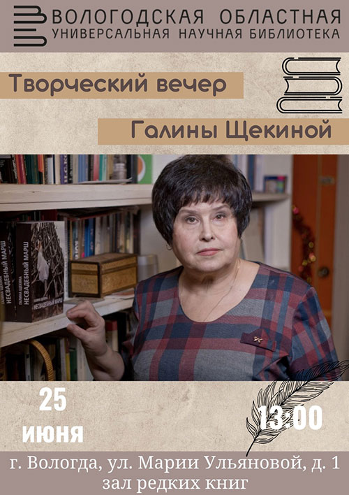 В творческом вечере Г. А. Щекиной примут участие доцент кафедры теории, истории культуры и этнологии Вологодского государственного университета Людмила Якушева, литературный критик Сергей Фаустов и руководитель литобъединения «Ступени» Нина Писарчик.