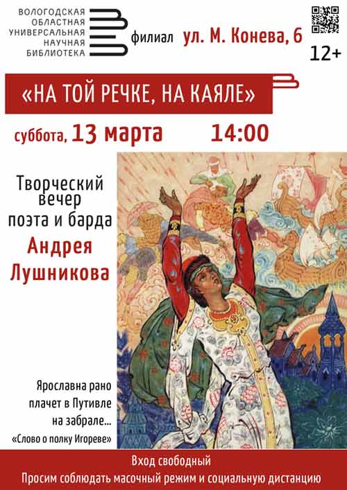 Творческий вечер «На той речке, на Каяле» поэта и барда, члена Союза писателей России Андрея Лушникова пройдет в субботу, 13 марта, в читальном зале филиала Вологодской областной универсальной научной библиотеки (ул. Конева, 6).