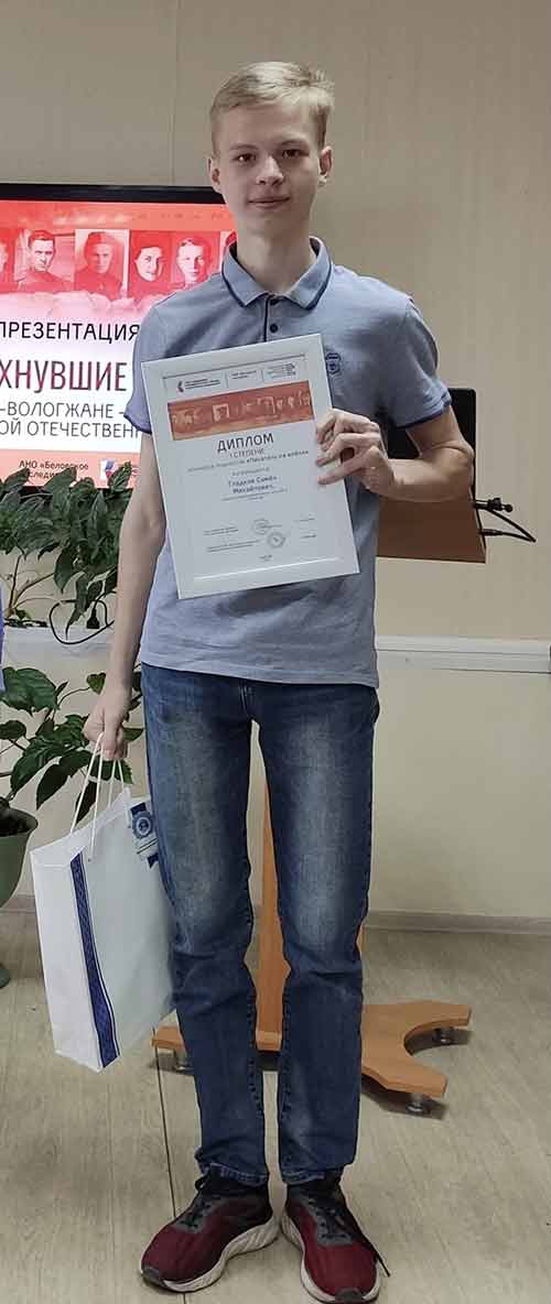 Победитель конкурса подкастов "Писатель на войне" Семен Гладков (10 класс, МОУ "СОШ № 17", город Вологда)