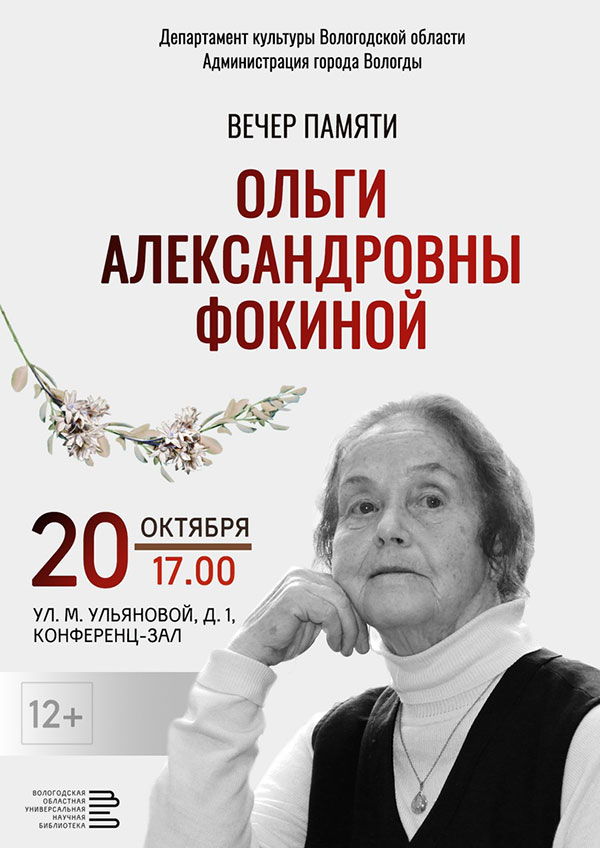 Вечер памяти поэта Ольги Александровны Фокиной пройдет в пятницу, 20 октября, в конференц-зале Вологодской областной универсальной научной библиотеки (ул. М. Ульяновой, 1).