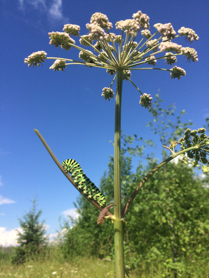 2. На следующий день я вновь решил полакомиться земляникой. Иду всё на ту же заветную полянку, что за малинником. Случайно увидел (такая уж полянка!) дудник лесной, на котором сидела необычайно красивая гусеница. Личинку бабочки Махаона можно узнать без труда. Я тронул её, и она выпустила свои ярко-оранжевые рожки. Мне захотелось сохранить в памяти этот момент. Достаю из корзинки фотоаппарат и делаю удачный кадр. Неплохая получилась прогулка!