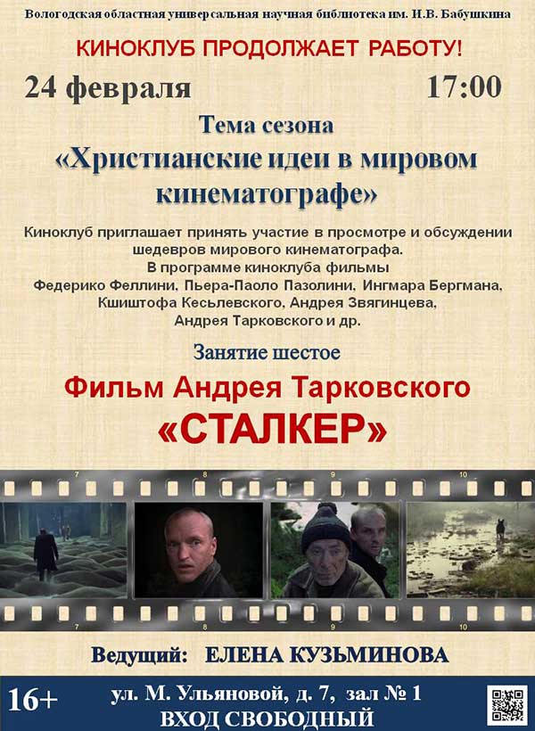 24 февраля в 17.00 состоится заседание киноклуба «Христианские идеи в мировом кинематографе». Занятие посвящено творчеству Андрея Тарковского. Будет показан фильм «Сталкер»