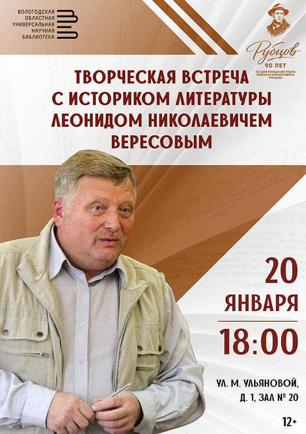 Творческая встреча с исследователем жизни и творчества Николая Рубцова, череповецким историком и краеведом Леонидом Николаевичем Вересовым пройдёт во вторник, 20 января, в рамках мероприятий, посвященных 90-летию со дня рождения нашего земляка, выдающегося русского поэта.
