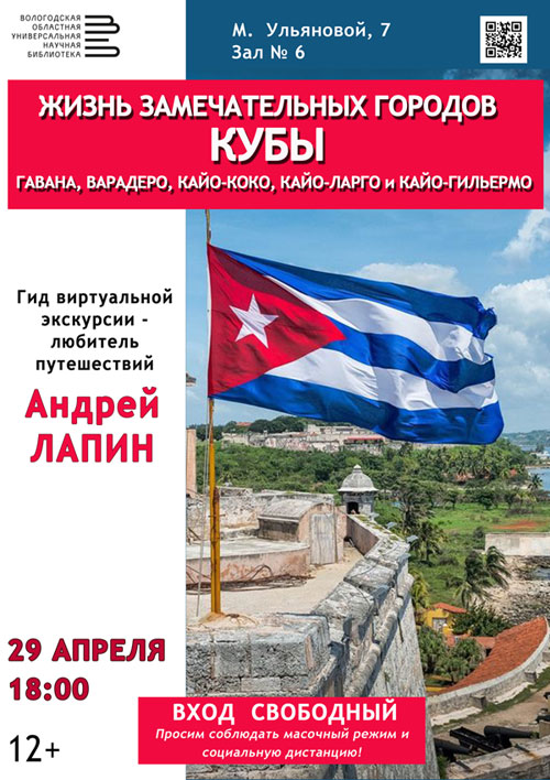 Совершить путешествие сразу по нескольким кубинским городам: Гаване, Варадеро, Кайо-Коко, Кайо-Ларго и Кайо-Гильермо предлагаем в рамках проекта «Жизнь замечательных городов». Проведет виртуальную экскурсию профессиональный путешественник Андрей Лапин 29 апреля в 18 часов (М. Ульяновой, 7, зал №6).