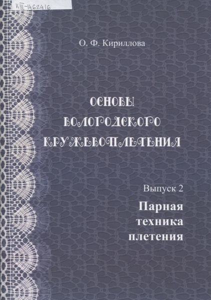 Кириллова О. Ф. Основы вологодского кружевоплетения : методическое пособие . Вып. 2. Парная техника плетения / О. Ф. Кириллова ; [авт. вступ. ст. Н. А. Кутекина ; отв. за вып. О. Ф. Оленева] ; Обл. научно-метод. центр культуры. Вологда : ОНМЦК, 2014 (ИП Киселев А. В.). 116 с. : ил., цв. ил. ISBN 978-5-901432-30-3