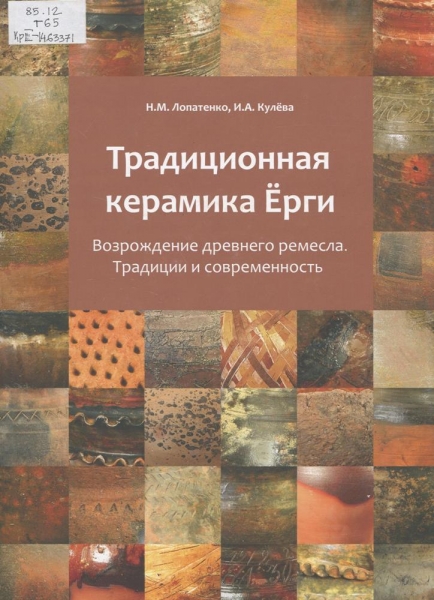 Лопатенко Н. М. Традиционная керамика Ерги : возрождение древнего ремесла. Традиции и современность : [каталог] / Н. М. Лопатенко, И. А. Кулева ; [фот.: Е. Иванов] ; Межпоселенч. центр традиц. нар. культуры. - Череповец : ИД-Принт, 2014. - 157, [2] с. : цв. ил. - ISBN 978-5-91958-008-9