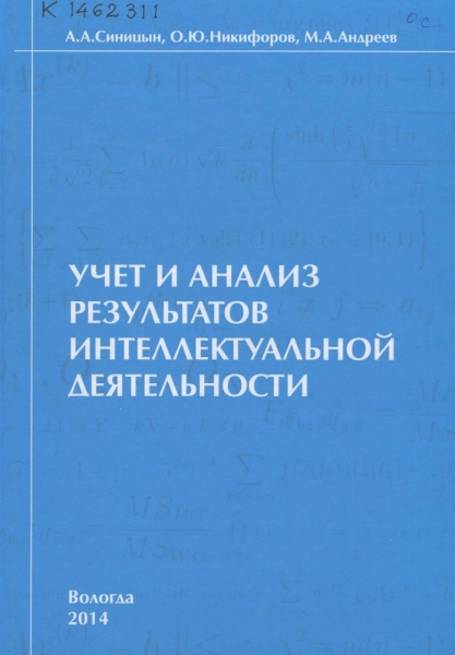 Синицын А. А. Учет и анализ результатов интеллектуальной деятельности : учебное пособие / А. А. Синицын, О. Ю. Никифоров, М. А. Андреев ; М-во образования и науки Рос. Федерации, Вологод. гос. ун-т. - Вологда : ВоГУ, 2014 (Вологодская типография). - 158 с. : цв. ил., табл. - ISBN 978-5-87851-541-2