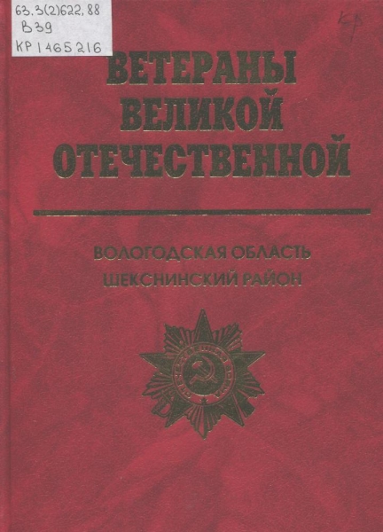 Ветераны Великой Отечественной. Вологодская область. Шекснинский район / Правительство Вологод. обл., Сев. отд-ние Археогр. комис. РАН, Вологод. обл. отд-ние Рос. фонда мира, Вологод. обл. совет ветеранов войны и труда [и др. ; сост. и авт. предисл.: Г. В. Шириков, С. Н. Цветков, Н. А. Лоншакова ; обществ. редкол.: А. В. Зелянин (отв. ред.) и др.]. - Вологда : Сад-огород, 2015. - 414, [1] с., [10] л. ил., портр. : ил., портр., табл. - (Ветераны Великой Отечественной: обществ. редкол.: В. В. Судаков (гл. науч. ред.) [и др.]). - ISBN 978-5-905713-65-1.