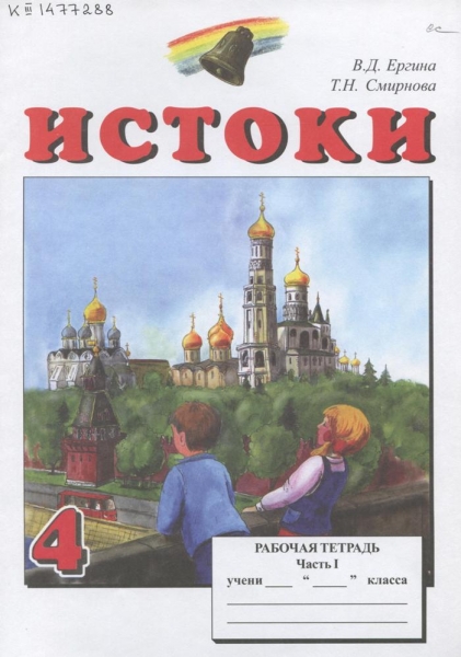 Ергина В. Д. Истоки 4 : рабочая тетрадь : [для 4 класса общеобразовательных учебных заведений]. Ч. 1 / В. Д. Ергина, Т. Н. Смирнова ; под общ. ред. И. А. Кузьмина. - 5-е изд. - Москва : Истоки, 2016 (Вологда : Полиграф-Периодика). - 35, [1] с. : ил. - (Социокультурные истоки) (Библиотека Технологической школы бизнеса) (Социокультурный системный подход к истокам в образовании). - ISBN 5-86073-106-X.