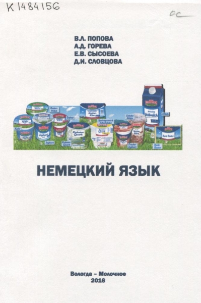 Немецкий язык : учебное пособие : для аудиторной и самостоятельной работы студентов по направлениям подготовки 19.02.07 «Технология молока и молочных продуктов», 19.03.03 «Продукты питания животного происхождения», 15.03.02 «Технологические машины и оборудование» / В. Л. Попова [и др.] ; М-во сел. хоз-ва Рос. Федерации, Вологод. гос. молочнохоз. акад. им. Н. В. Верещагина, Каф. иностр. яз. - Вологда ; Молочное : ВГМХА, 2016. - 123 с. : ил. - ISBN 978-5-98076-214-8.