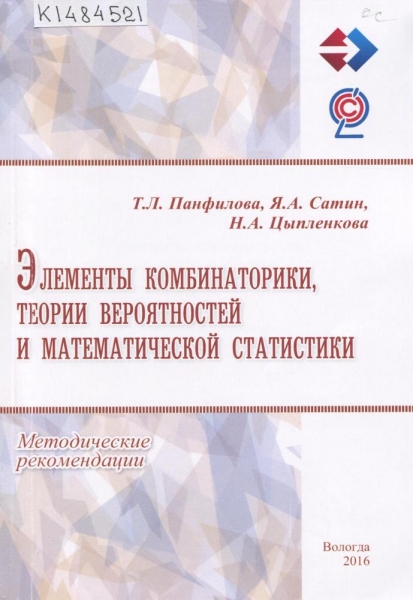 Панфилова Т. Л. Элементы комбинаторики, теории вероятностей и математической статистики : методические рекомендации / Т. Л. Панфилова, Я. А. Сатин, Н. А. Цыпленкова ; Департамент образования Вологод. обл., Вологод. ин-т развития образования, Вологод. гос. ун-т. - Вологда : ВИРО, 2016 (Череповец : ЧГУ). - 125, [1] с. : ил. - ISBN 978-5-87590-454-7.