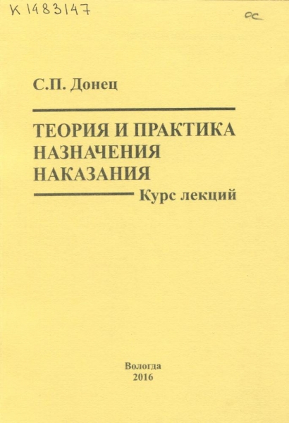 Донец С. П. Теория и практика назначения наказания : курс лекций : [учебное пособие] / С. П. Донец ; М-во образования и науки Рос. Федерации, Вологод. гос. ун-т. - Вологда : ВоГУ, 2016. - 183, [1] с. : ил. - ISBN 978-5-87851-698-3.