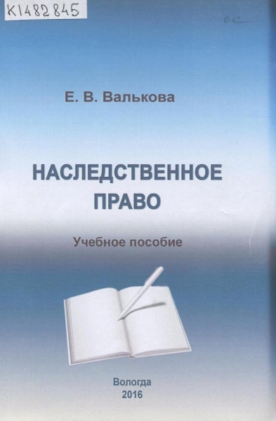 Валькова Е. В. Наследственное право : учебное пособие / Е. В. Валькова ; Федер. служба исполнения наказаний, Волог. ин-т права и экономики. - Вологда : ВИПЭ ФСИН России, 2016. - 197 с. : табл. - ISBN 978-5-94991-366-6.