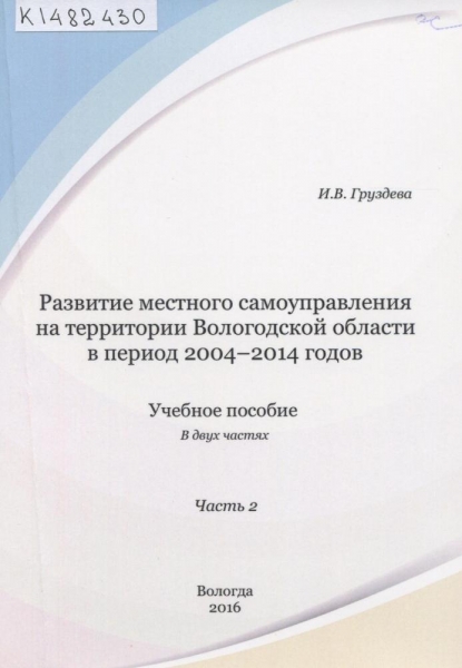 Груздева И. В. Развитие местного самоуправления на территории Вологодской области в период 2004-2014 годов : учебное пособие. В 2 ч. Ч. 2 / И. В. Груздева. - Вологда : ИСЭРТ РАН, 2016. - 248 с. : ил., карты, табл. - ISBN 978-5-93299-349-1. - ISBN 978-5-9399-351-4.