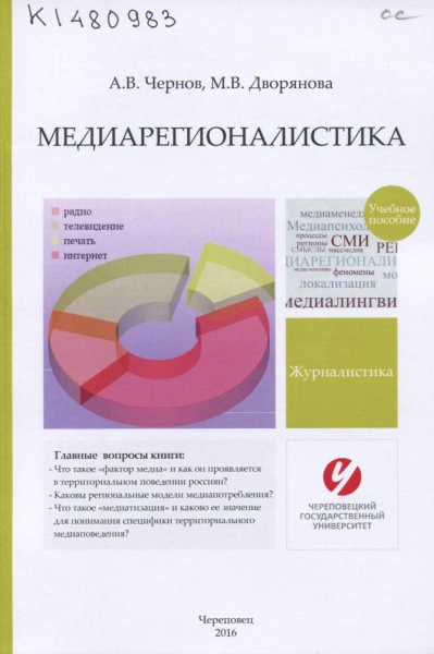 Чернов А. В. Медиарегионалистика : учебное пособие / А. В. Чернов, М. В. Дворянова ; Череповец. гос. ун-т. - Череповец : ЧГУ, 2016. - 77 с. : табл. - ISBN 978-5-85341-702-1.