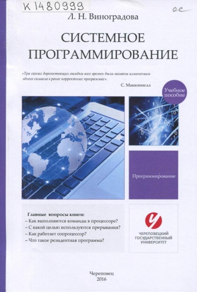 Виноградова Л. Н. Системное программирование : учебное пособие / [Л. Н. Виноградова] ; Череповец. гос. ун-т. - Череповец : ЧГУ, 2016. - 207 с. : табл. - ISBN 978-5-85341-689-5.