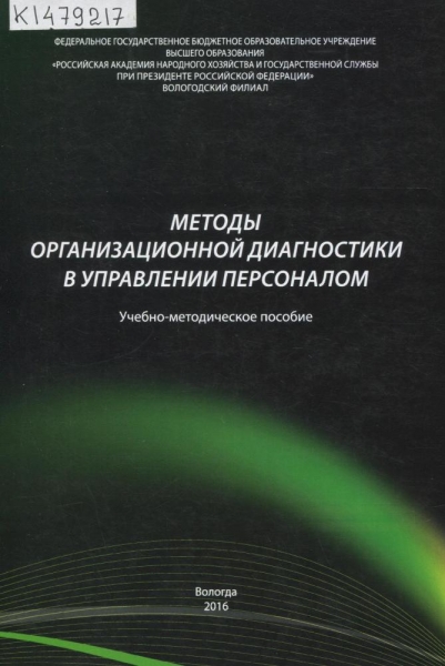 Методы организационной диагностики в управлении персоналом : учебно-методическое пособие [для студентов высших учебных заведений] / Рос. акад. нар. хоз-ва и гос. службы при Президенте Рос. Федерации, Вологод. фил. ; [Е. В. Киселева и др. ; под ред. Е. В. Киселевой]. - Вологда : Вологодский филиал РАНХиГС, 2016 (Сад-огород). - 421 с. : ил., табл. - ISBN 978-5-906850-20.