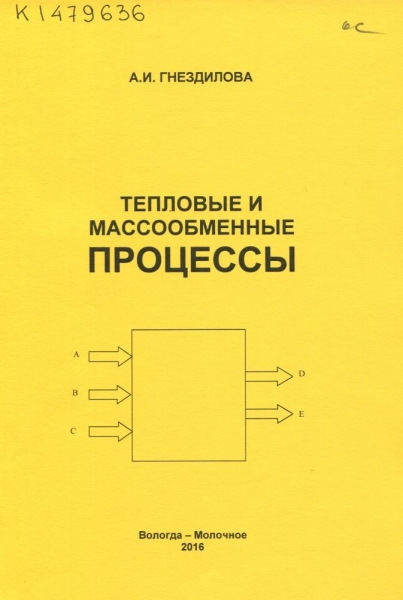 Гнездилова А. И. Тепловые и массообменные процессы : учебное пособие для подготовки магистров по направлениям : 15.04.02 «Технологические машины и оборудование» магистерская программа «Машины и аппараты» и 35.04.06 «Агроинженерия» магистерская программа «Машины и аппараты пищевых производств» / [А. И. Гнездилова] ; М-во сел. хоз-ва РФ, Вологод. гос. молочнохоз. акад. им. Н. В. Верещагина, Технолог. фак., Каф. технолог. оборудования. - Вологда ; Молочное : ВГМХА, 2016. - 106, [1] с. : ил., табл. - ISBN 978-5-98076-211-7.