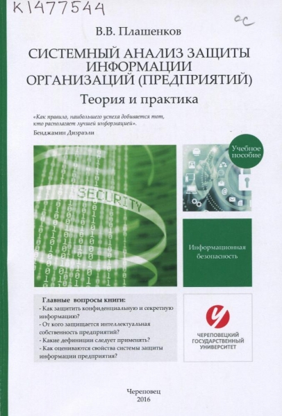 Плашенков В. В. Системный анализ защиты информации организаций (предприятий). Теория и практика : учебное пособие / В. В. Плашенков ; Череповецкий гос. ун-т. - Череповец : ЧГУ, 2016. - 231 с. : ил., табл. - ISBN 978-5-85341-685-7.
