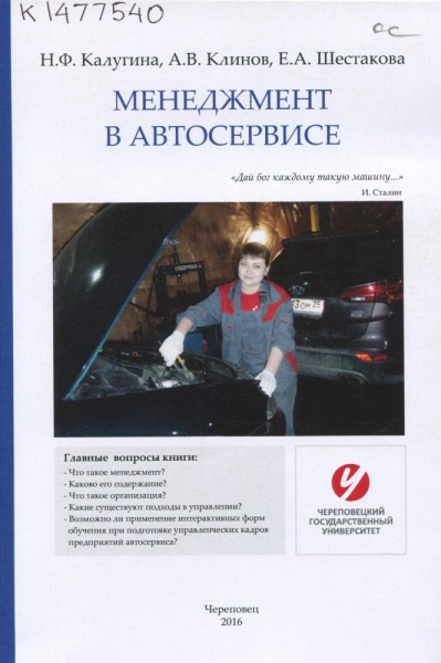 Калугина Н. Ф. Менеджмент в автосервисе : учебное пособие / Н. Ф. Калугина, А. В. Клинов, Е. А. Шестакова ; Череповецкий гос. ун-т. - Череповец : ЧГУ, 2016. - 79, [2] с. : ил. - ISBN 978-5-85341-679-6.
