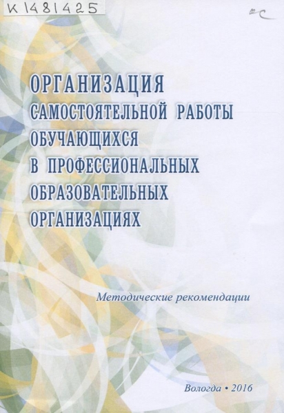 Организация самостоятельной работы обучающихся в профессиональных образовательных организациях : методические рекомендации / Департамент образования Вологод. обл., Вологод. ин-т развития образования ; [сост. : С. Л. Шихов, Ю. Н. Бекряев]. - Вологда : ВИРО, 2016. - 26 с. - ISBN 978-5-87590-445-5.