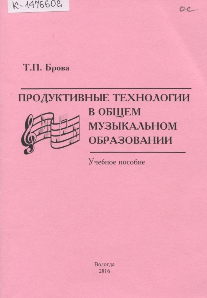 Брова Т. П. Продуктивные технологии в общем музыкальном образовании : учебное пособие [для вузов, школ, средних профессиональных учебных заведений] / Т. П. Брова ; [ред. Н. В. Сажина] ; Вологод. гос. ун-т. - Вологда : ВоГУ, 2016. - 70 с. : ил. - ISBN 978-5-87851-664-8.