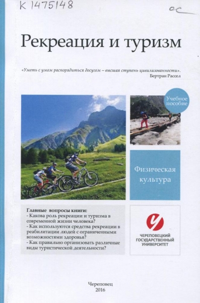 Рекреация и туризм : учебное пособие / Череповец. гос. ун-т ; [А. А. Кылосов, Е. В. Максимихина, Е. И. Алешина, Ю. Ю. Алексина] ; под общ. ред. А. А. Кылосова. - Череповец : ЧГУ, 2016. - 203 с. : табл. - (Физическая культура). - ISBN 978-5-85341-677-2.
