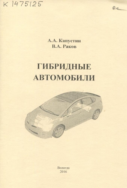 Капустин А. А. Гибридные автомобили : учебное пособие / А. А. Капустин, В. А. Раков ; М-во образования и науки Рос. Федерации, Вологод. гос. ун-т. - Вологда : ВоГУ, 2016. - 95, [1] с. : ил., табл. - ISBN 978-5-87851-653-2.