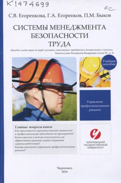 Егоренкова С. В. Системы менеджмента безопасности труда : учебное пособие / С. В. Егоренкова, Г. А. Егоренков, П. М. Быков ; [науч. ред. : В. В. Ермилов] ; Череповец. гос. ун-т. - Череповец : ЧГУ, 2016. - 162 с. : ил., табл. - ISBN 978-5-85341-681-9.