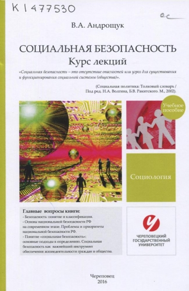 Андрощук В. А. Социальная безопасность : курс лекций : учебное пособие / В. А. Андрощук ; Череповец. гос. ун-т. - Череповец : ЧГУ, 2016. - 91 с. - (Социолог). - ISBN 978-5-85341-686-4.