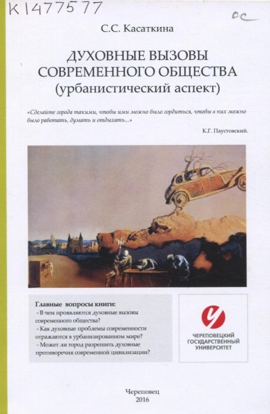 Касаткина С. С. Духовные вызовы современного общества (урбанистичекий аспект) : учебное пособие / С. С. Касаткина ; Череповецкий гос. ун-т. - Череповец : ЧГУ, 2016. - 94 с. : ил. - ISBN 978-5-85341-687-1.