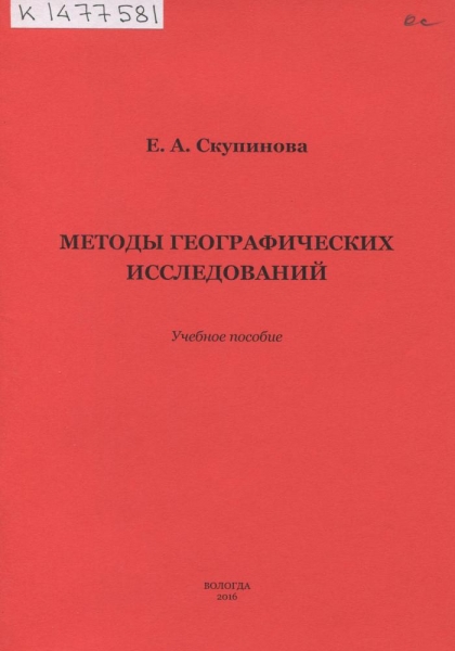 Скупинова Е. А. Методы географических исследований : учебное пособие / Е. А. Скупинова ; М-во образования и науки Рос. Федерации, Вологод. гос. ун-т. - Вологда : ВоГУ, 2016. - 48 с. - ISBN 978-5-87851-667-9.
