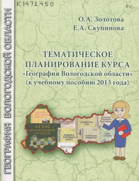Золотова О. А. Тематическое планирование курса «География Вологодской области» : (к учебному пособию 2013 года) : учебно-методическое пособие / Золотова О. А., Скупинова Е. А. ; под ред. Е. А. Скупиновой ; М-во образования и науки Рос. Федерации, Вологод. гос. ун-т, Лаб. геоэкологии. - Вологда : Учебная литература : ВоГУ, 2016 (Полиграф-Периодика). - 77 с. : табл. - (География Вологодской области). - ISBN 978-5-87851-642-6.