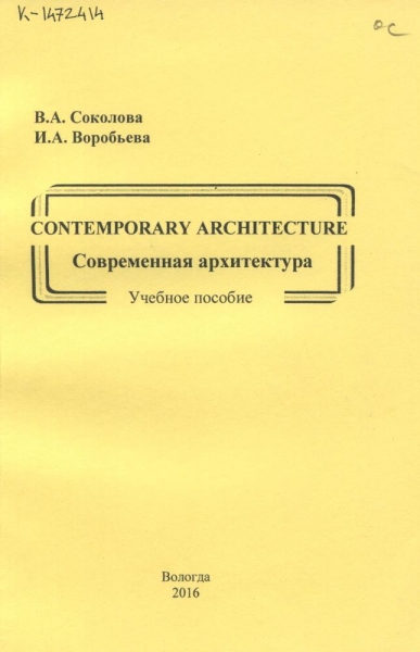 Соколова В. А. Contemporary architecture : учебное пособие [по английскому языку для вузов] / В. А. Соколова, И. А. Воробьева ; Вологод. гос. ун-т. - Вологда : ВоГУ, 2016. - 159 с. : ил. - ISBN 978-5-87851-637-2.